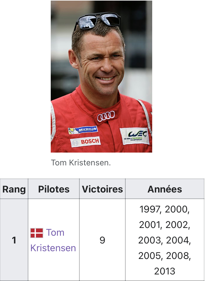 Monsieur Kristensen Tom alias monsieur le Mans suivi de Jacky Icks (belge), Darek Bell (anglais), les français culminent à la 6ème place avec Henri Pescardo et Yanick Dalmas. Cependant , la France totalise 43 victoires de pilotes par nation derrière le Royaume Uni (44) et ce devant l’Allemagne, les Etats Unis, l’Italie, la Belgique,le Danemark, la Suisse et le Japon. Les pilotes français Henri Pescardo et Bob Wollek enregistrent les plus grands nombres de départs de 1966 à 2000 (33) et (30) devant le japonnais Yojiro Terada (29) et Derek Bell UK (26), suivi d’Emmanuel Collard (25) et de François Migault (24). La représentativité féminine est incarnée par Anne Charlotte Verney et Marie Claude Beaumont qui ont occupé des places de choix de part et d »autre de la belge Vanina Ickx. Odette Siko (4ème) et Anne-Charlotte (6ème) ont eu les meilleurs résultats respectivement en 1932 et en 1961. Le vainqueur français le plus jeune toutes catégories confondues Julien Andauer (18 ans et 352 jrs – en 2018). Yannick Dalmas (peugeot, porsche,mc laren, bmw) vainqueur avec plus de constructeurs.
