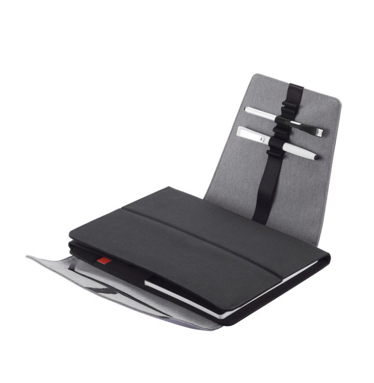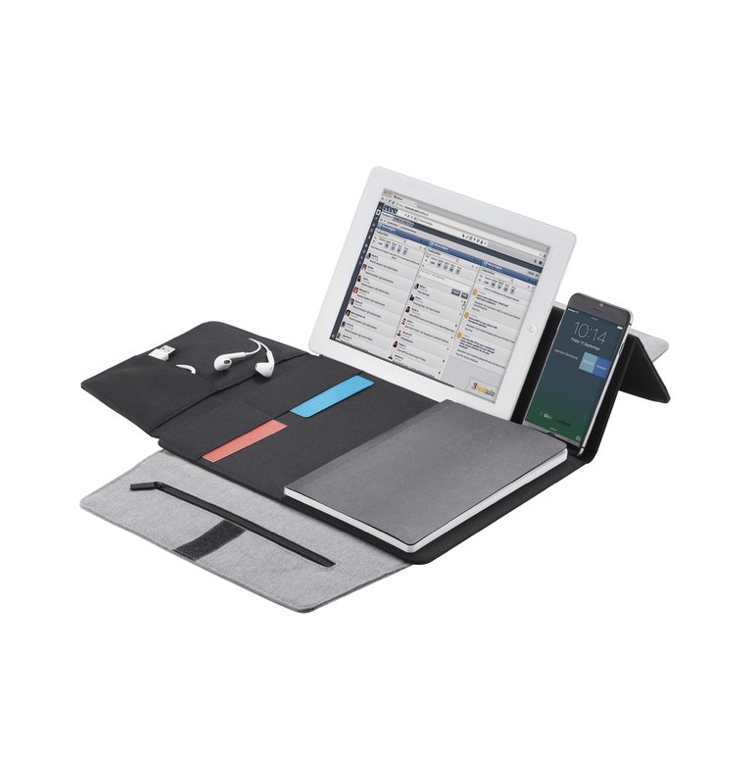 La couverture du porte-documents se transforme en support pour tablette et téléphone