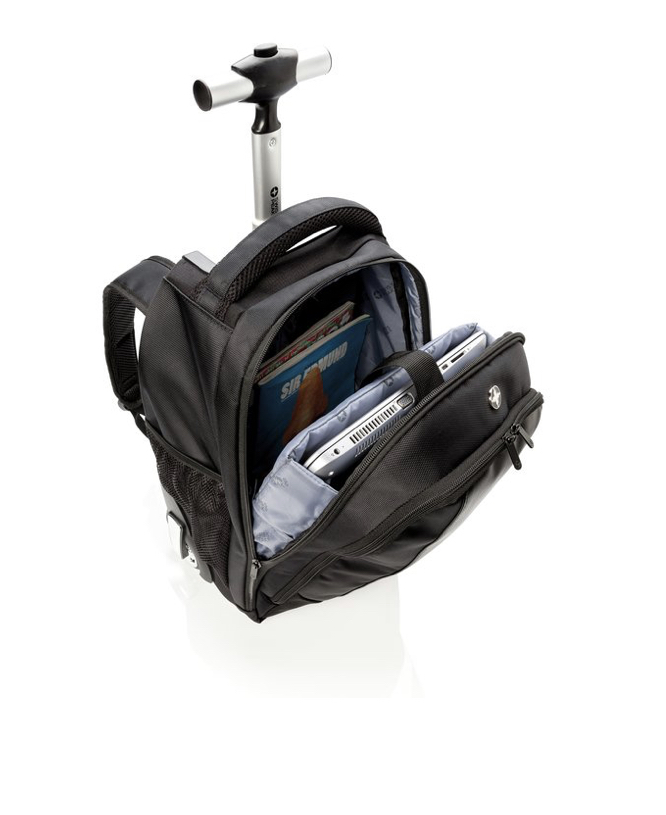 Profitez au maximum de votre week-end avec ce sac à dos à roulettes de Swiss Peak®. Son format compact vous permet de le ranger facilement dans un compartiment cabine. Ajoutez votre logo pour mettre votre marque à l’honneur dans le monde entier. Polyester et polyuréthane sans PVC